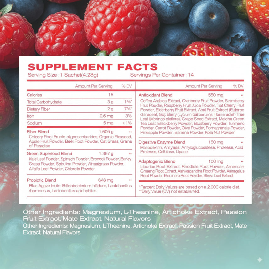 It works by smoothing digestion and easing fluid retention so morning puff fades fast. A gentle mix of enzymes and fiber helps food move along comfortably, while prebiotics and probiotics support a balanced gut—sending calmer signals along the gut–skin axis. Light electrolytes like magnesium and botanicals such as artichoke encourage healthy hydration balance, so your body holds less water where you don’t want it. Antioxidant-rich fruits, greens, and tea defend against the tired, puffy look, and adaptogens help keep everyday stress in check. Mix one sachet with cold water each morning and let the inside-out de-bloat show on your face.